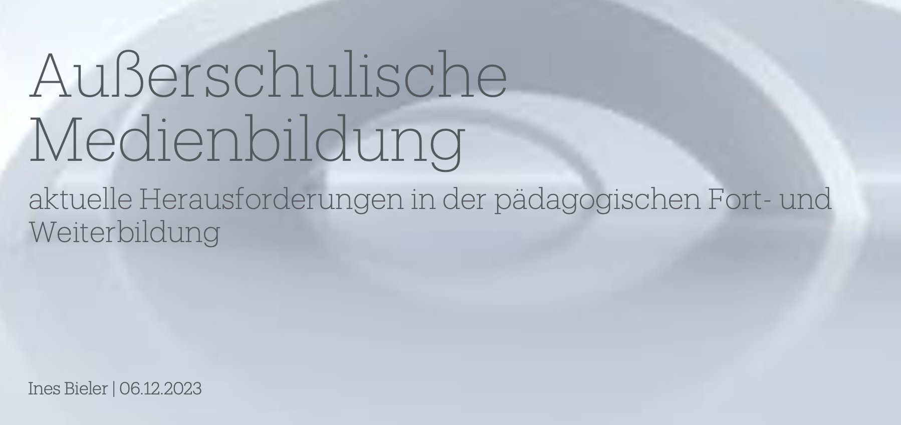 Für ein Panel durfte ich den Impuls geben. Obwohl das Panel unter der Überschrift "Außerschulische Medienbildung" stand, überwog doch im Podium der Anteil der Teilnehmer:innen aus dem Schulbereich: Landesinstitut, GEW, Lehrkraft bzw. Bildungsadministration. Ein Vertreter der Medienanstalt konnte aus dem außerschulischen Bereich beitragen.
