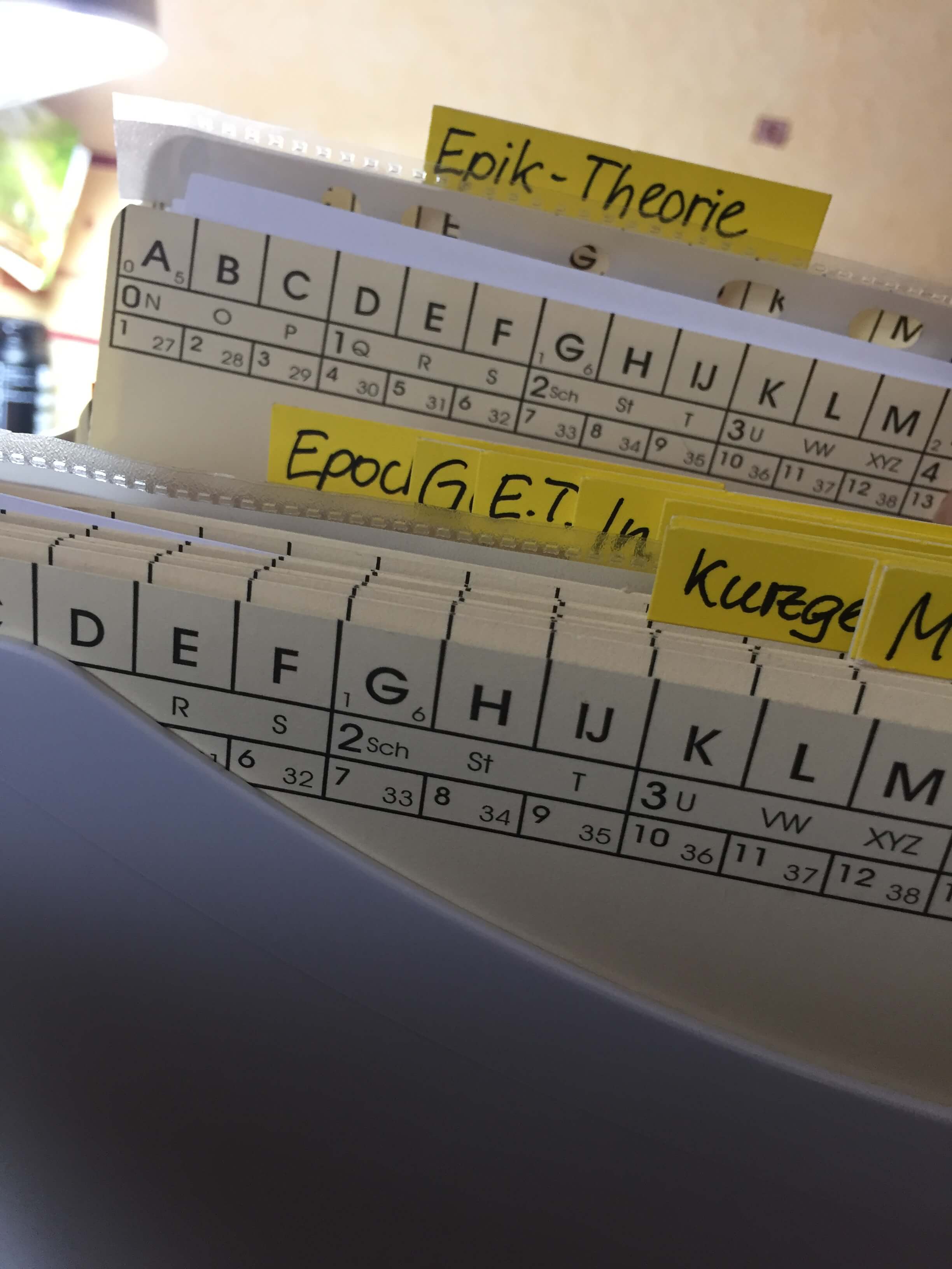 Classei gibt mir die Möglichkeit, alles in kleinen Portionen zu sortieren und durch die Mappen und entsprechende Kennzeichnung griffbereit zu haben. Ich versuche wirklich, die Materialien sehr genau zu trennen und zu bezeichnen. Vieles kann man an verschiedenen Stellen (Jahrgänge, Fächer, FoBi) einsetzen und will nicht erst lange überlegen, in welcher Rubrik man es abgelegt hat. So habe ich zum Thema Epik-allgemein in Sek. II einzelne Mappen für Theorie, Folien, Tests, Referatsthemen, Klausuren und natürlich für einzelne Werke.